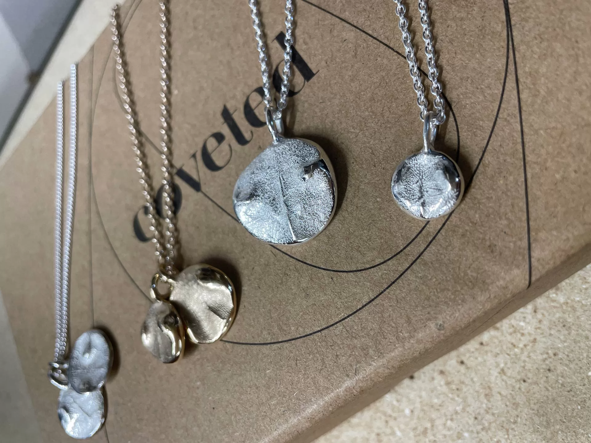 Each Coveted pendant is created using a putty impression of your pet’s nose or paw print, which is then cast in precious metals. The result is a personalised pet necklace that you can wear every day and treasure forever. Each piece of jewellery is created specifically for you and your pet, ensuring an unforgettable keepsake that you can wear and feel forever.